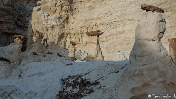 Nur wenige Kilometer von der Coyote Buttes South entfernt, befindet sich mit den Toadstool Hoodoos (Fliegenpilz-Felsen) ein gänzlich anderes Highlight dieser Gegend. Wir finden uns in einer bizarren Mondlandschaft aus pilzähnlichen Türmchen wieder, die man eigentlich kaum in Worte fassen kann. Wir sind so begeistert, dass wir bis lange nach Sonnenuntergang bleiben. Im Licht des Mondes und den unzähligen Sternen des Nachthimmels wirkt diese Landschaft noch surrealer, fast schon magisch.